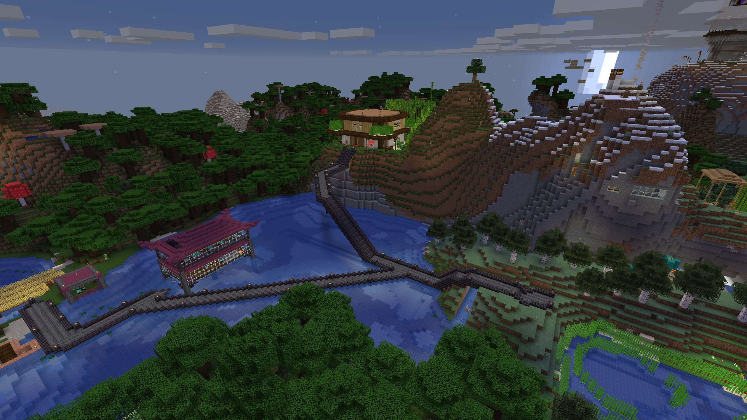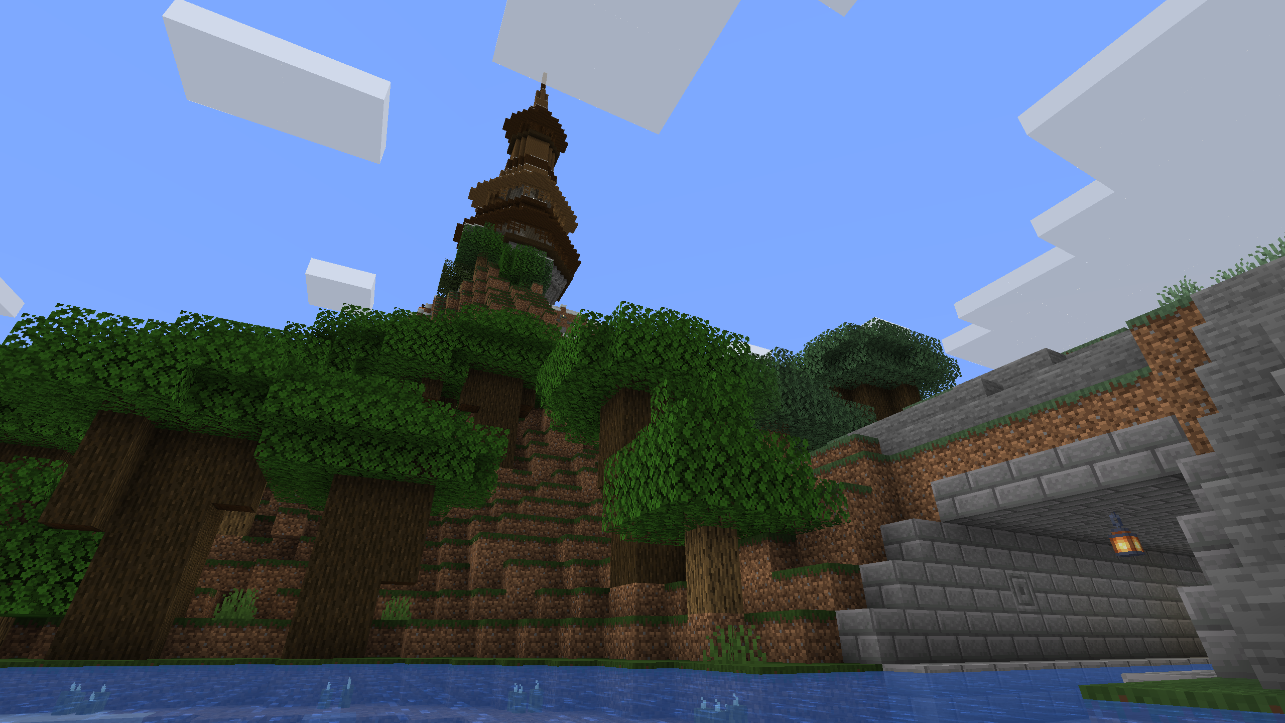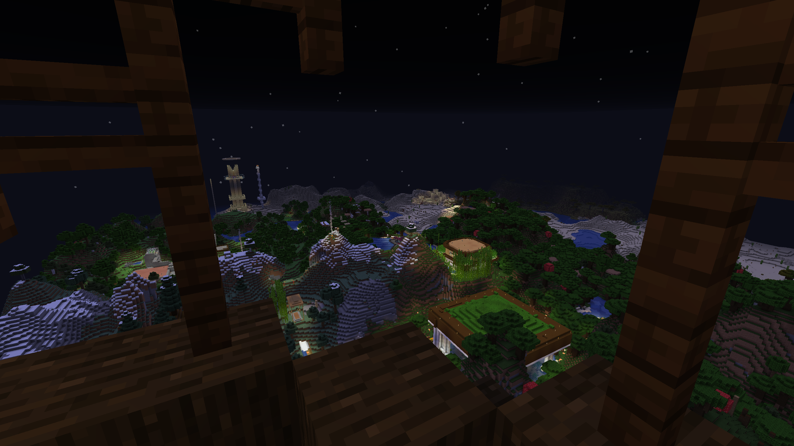An overview of spawn, with Khloris' stilt house and paths visible, as well as Janet's mushroom tower and mountain base.