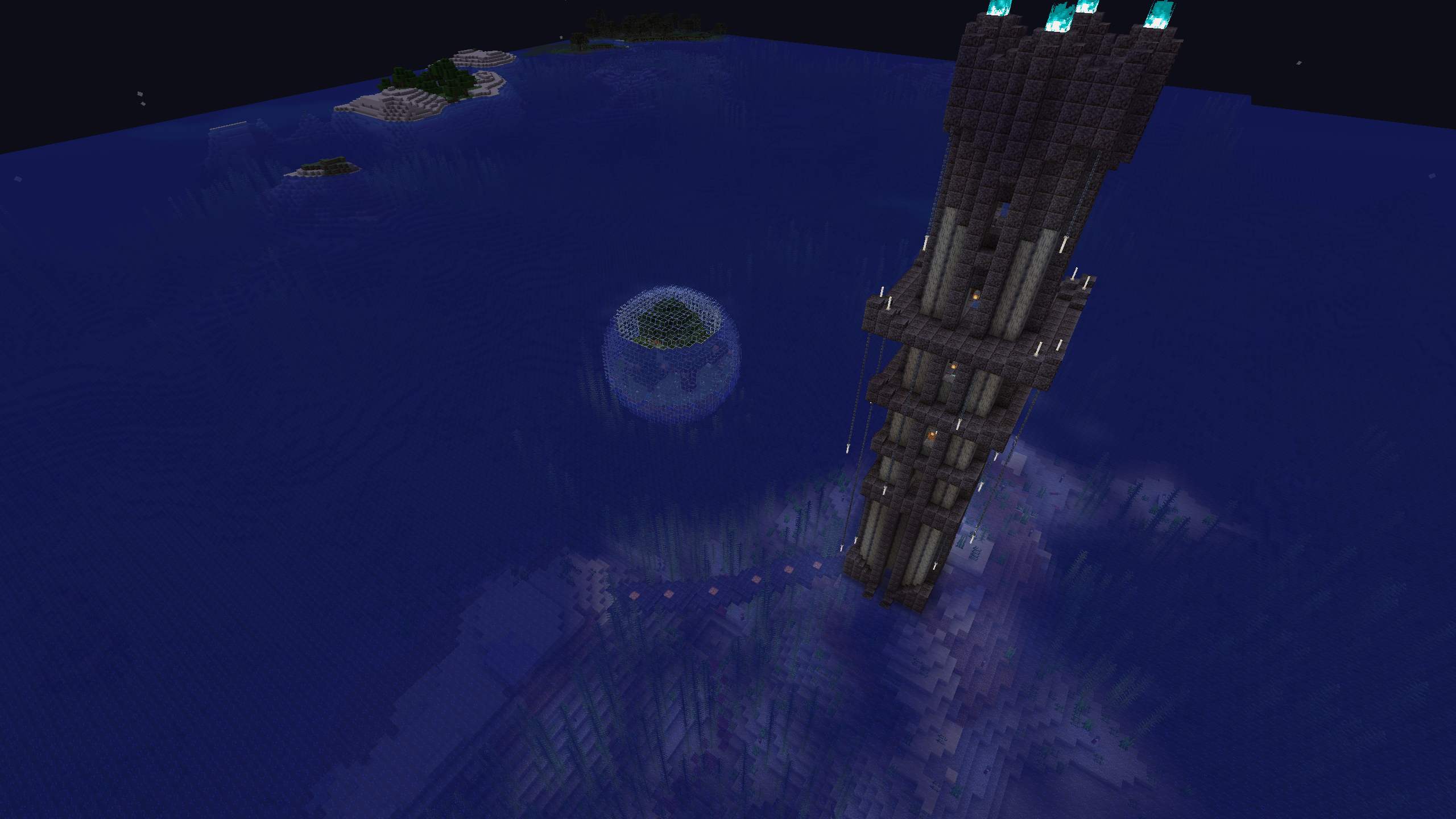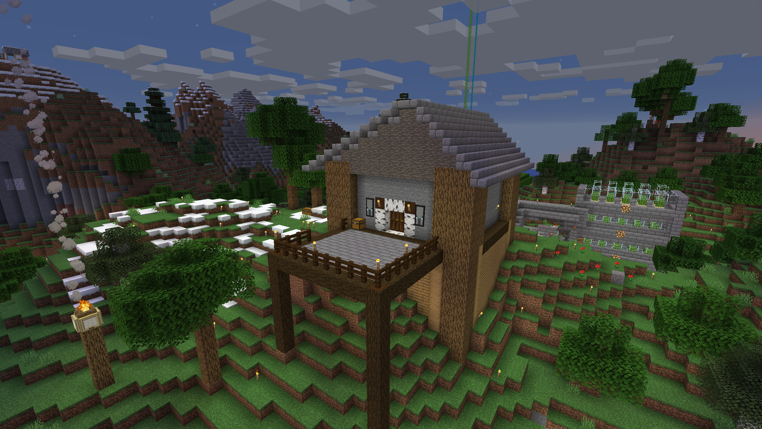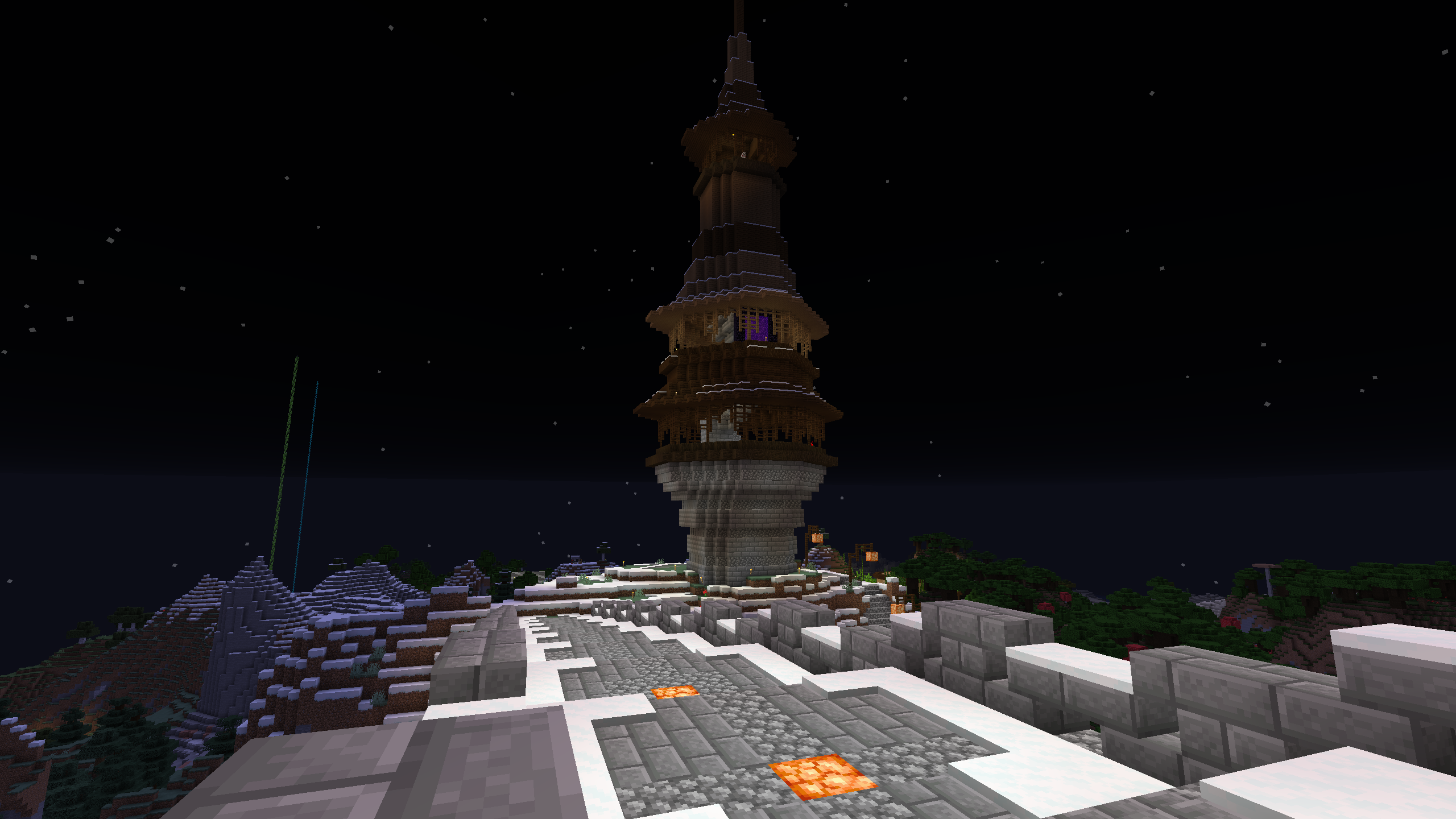 An overview of spawn, with Khloris' stilt house and paths visible, as well as Janet's mushroom tower and mountain base.